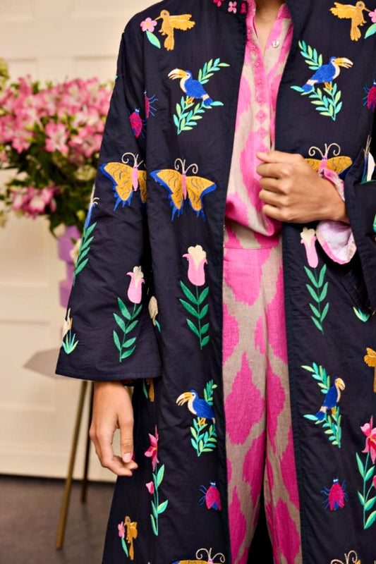 NIMO WITH LOVE CHILI PEPPER COAT WITH MEXICAN EMBROIDERY NAVY