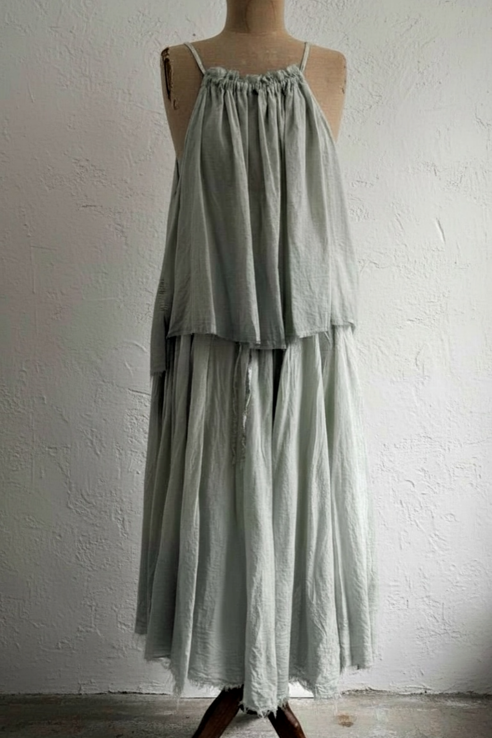 The Parasol Skirt is a long midi length skirt in beautiful soft, fine layers of cotton voile. It has an elastic waistband with a drawstring, and a feathered, raw edged hemline.