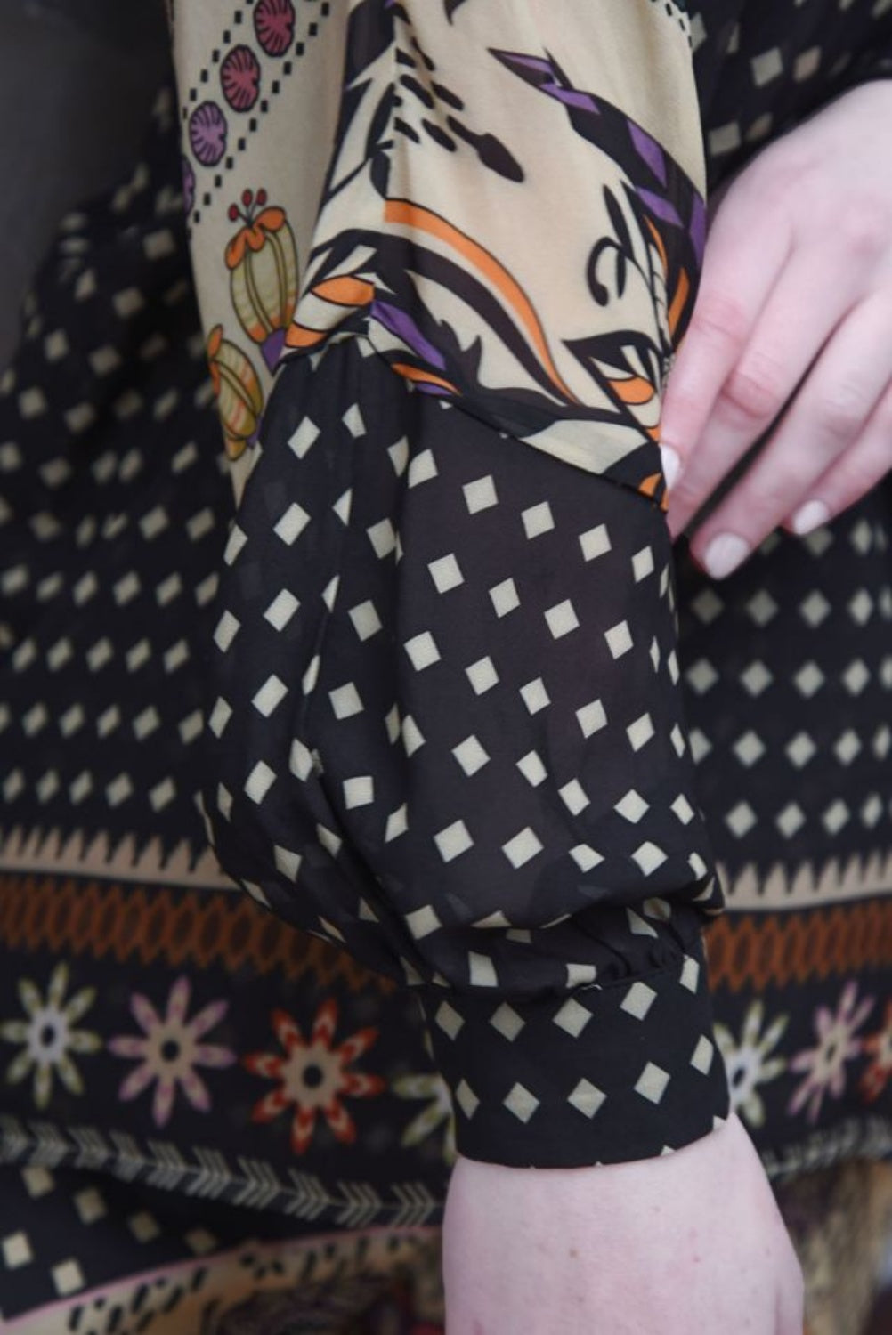 The 'Fired Up Top' in our breezy viscose georgette 'Spotted for the Season' print brings easy elegance to every day. Its V-neckline offers a flattering, feminine line, while the blouson sleeves add soft shape and movement. Finished with a fixed cuff and button fastening for a refined touch, it’s the perfect piece to dress up denim or elevate your favourite tailored looks.