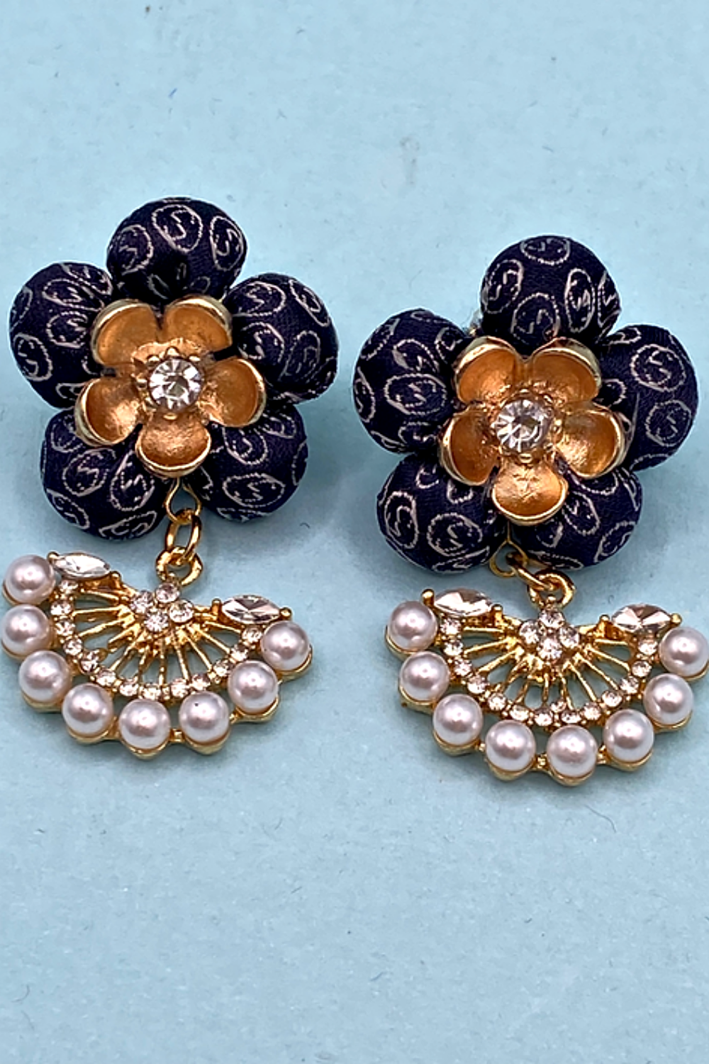 Navy micro GG logo silk earrings with pearl fans made from a vintage Gucci tie