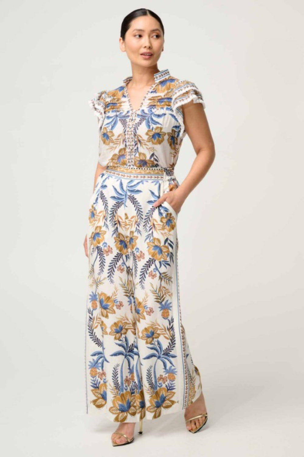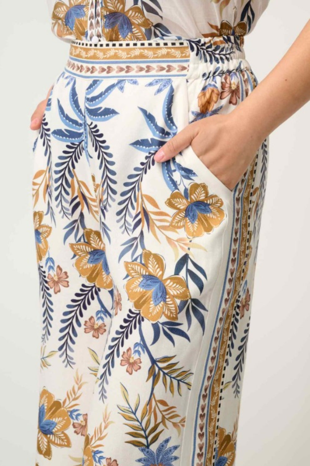The Golden Medina print showcases rich blue and golden floral motifs inspired by exotic landscapes, making these pants perfect for both resort escapes and city styling. Designed with a high-rise waist, side pockets, and a fluid wide-leg silhouette, they strike the perfect balance between relaxed and refined. Subtle border print detailing at the hem adds a designer touch, ensuring these pants stand out in any wardrobe.