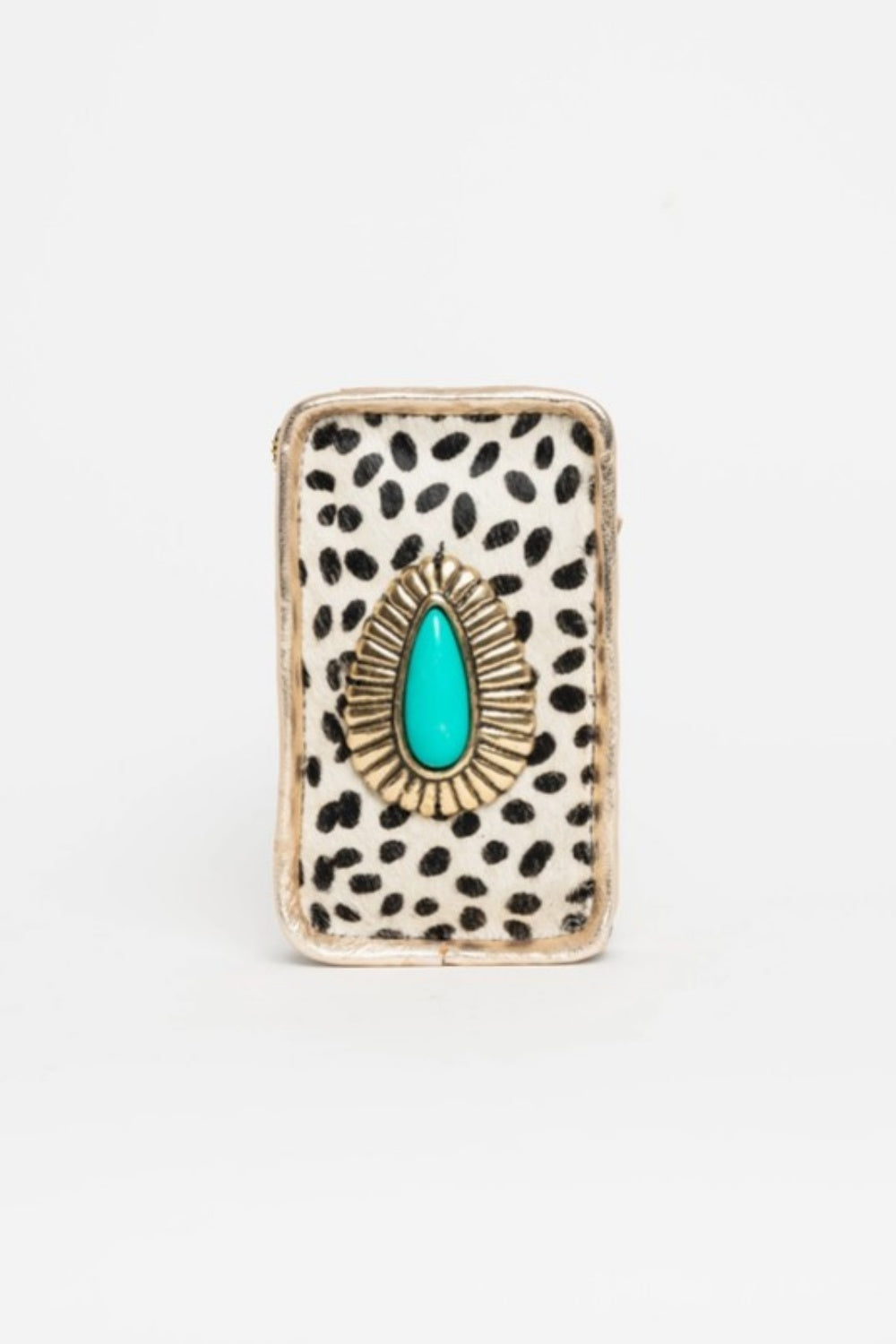 This is a mini crossbody mobile phone bag made from leather and dalmation printed ponyskin. It is embellished with a turquoise stone and gold stitching. The gold chain crossbody strap is detachable.