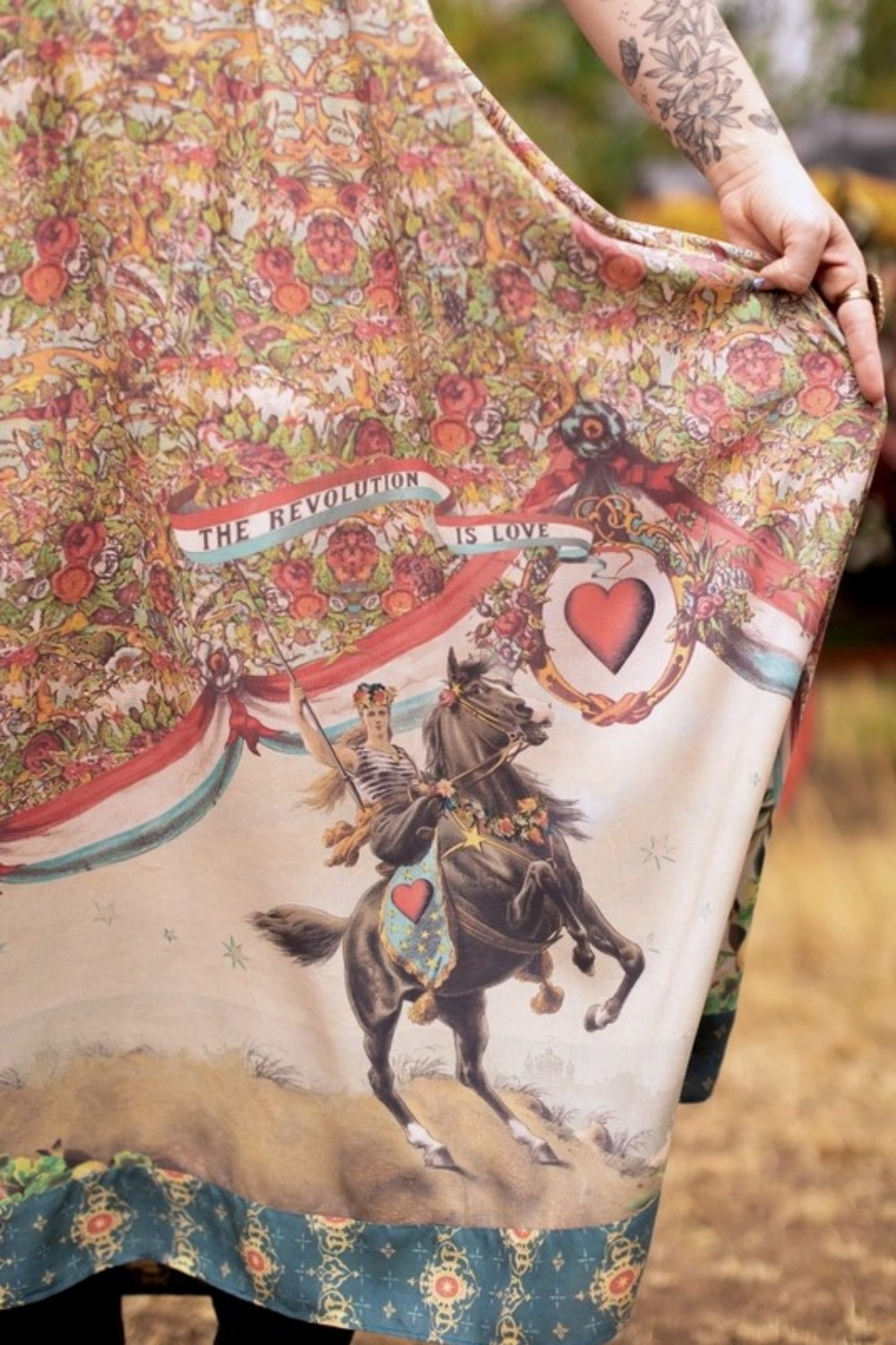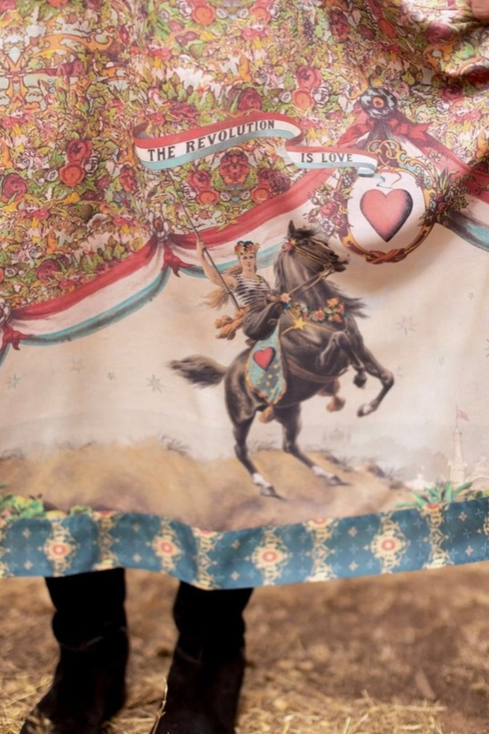 Meet Love Revolution. This beautiful new print celebrates the boldest force of all: love. At its heart is an extraordinary 1892 poster of a fearless woman on horseback, her banner flying with the words "The Revolution is Love." Surrounded by vintage florals, rosettes, and emblems of courage, this collection is rendered in romantic hues of faded red, sun-washed blue, and aged ivory. Each piece carries the quiet yet radical truth that beauty, hope, and love can transform the world β one fearless heart at a time. Long live love!Β