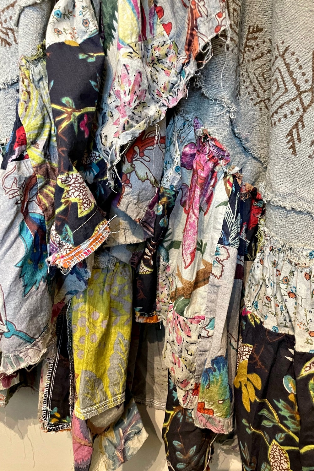 It is a proper wrap style which can be adjusted to fit perfectly. The bold, raw edged frill on the skirt is comprised of a patchwork of printed fabrics. The main part of the skirt is a heavier cheesecloth cotton.