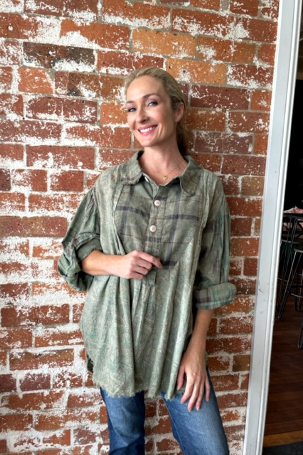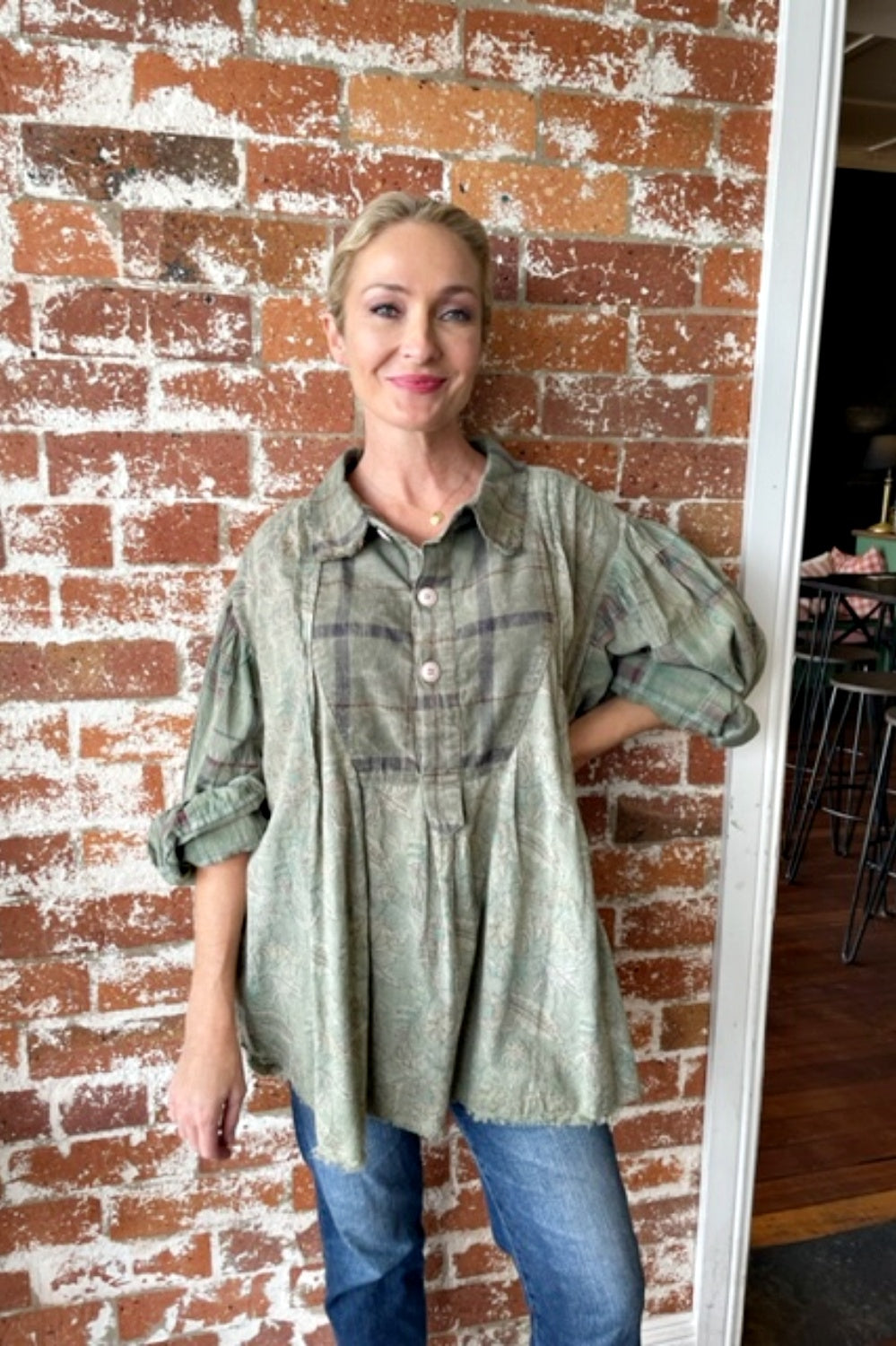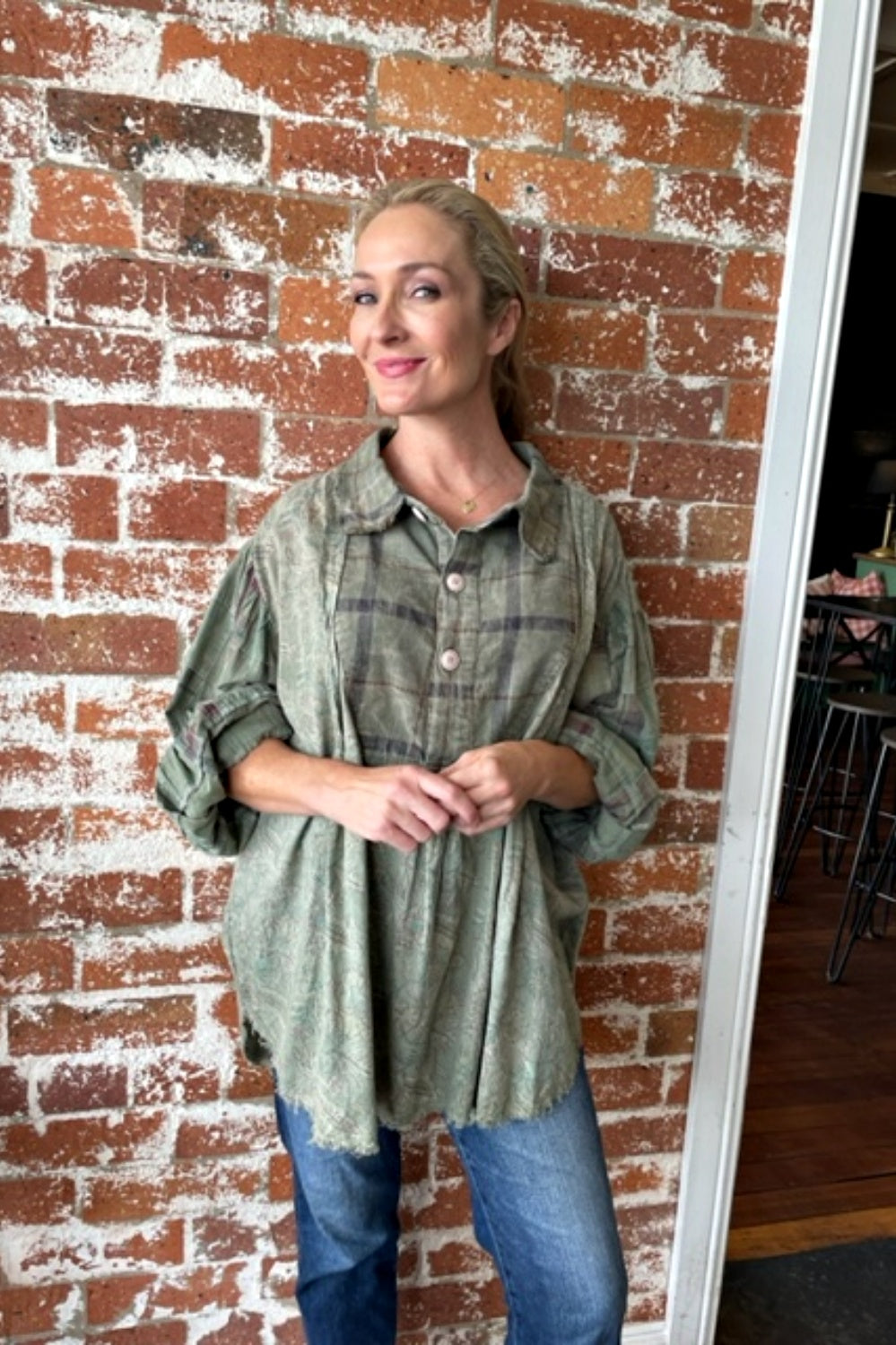 Raised by Wolves is for all the wild women! The Rowdy Shirt is in a soft sage green mix of contrast prints including a check and a traditional woodblock. The fabric has been expertly aged so it's super soft.
