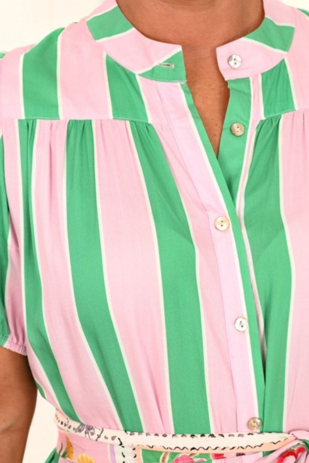 The Mackenzie Dress is in this fab pink and green stripe with soft tie contrasting belt.